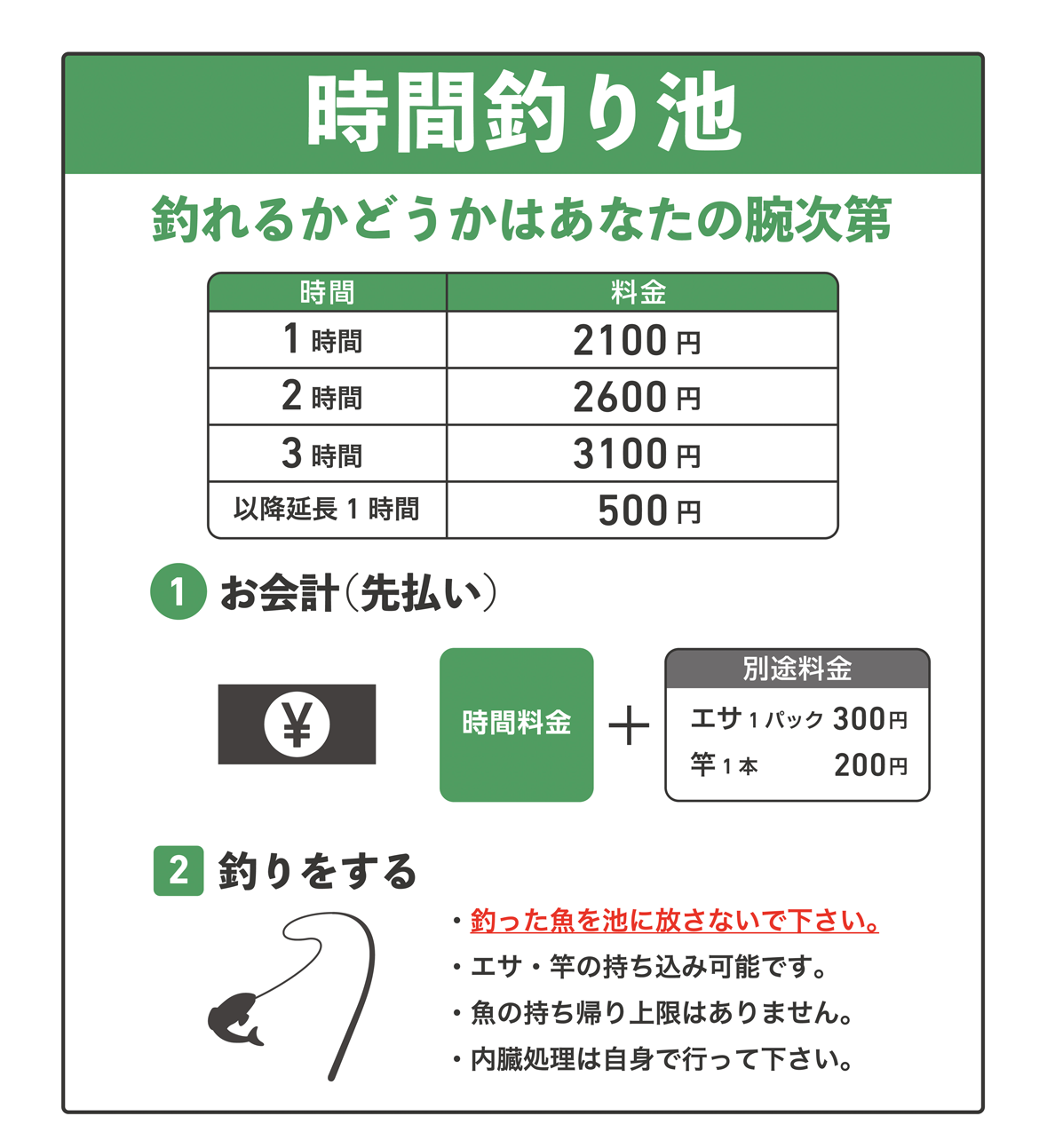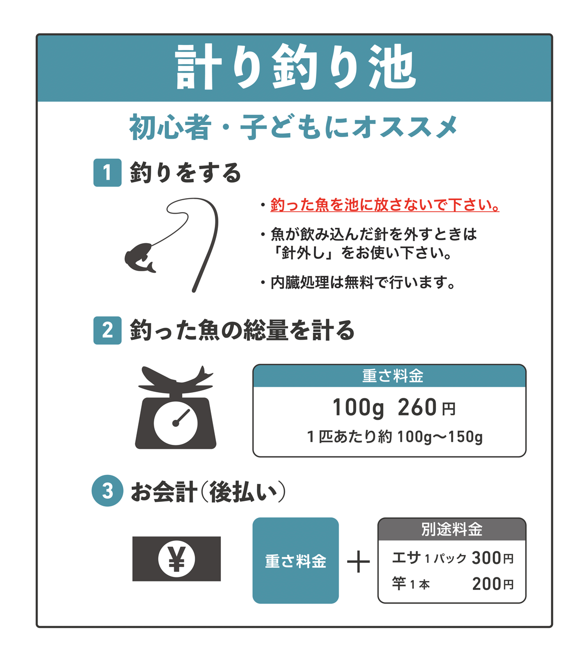 - ・エサKg釣り(めかた釣り)の内臓処理は無料で行います