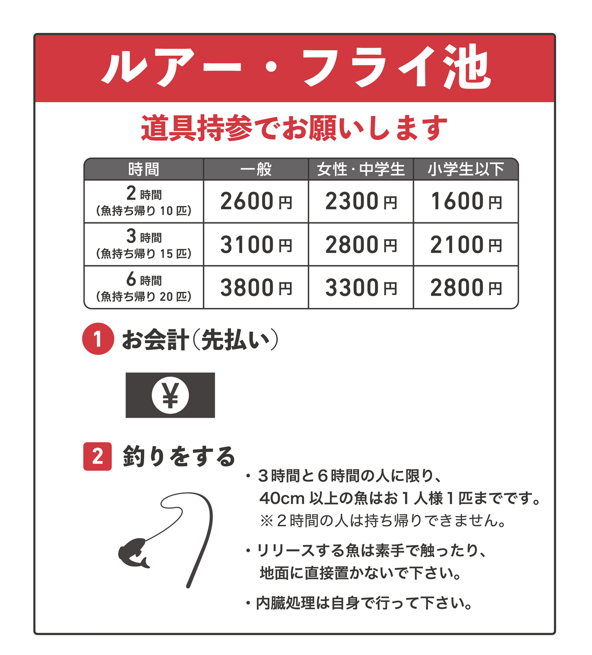 - ・ルアー・フライ釣りの方は各自で内臓処理してください。