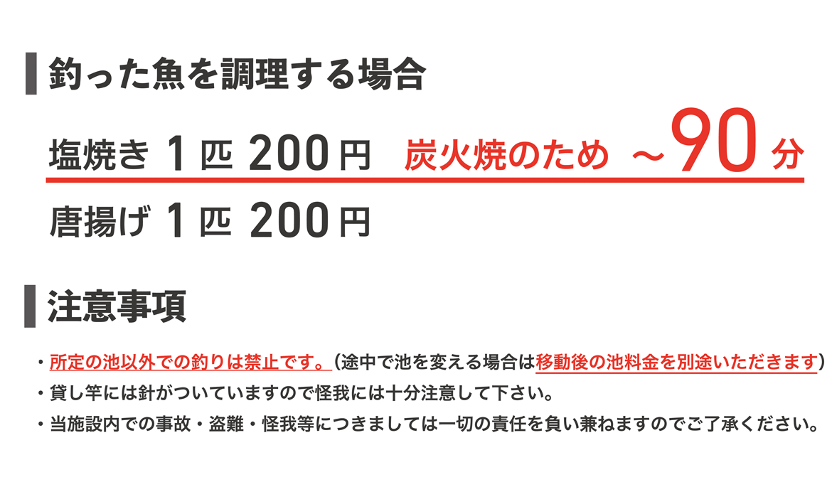 | 魚の調理 | 釣った魚の調理1匹:200円 塩焼きor唐揚げ 注:魚の調理数が多いと時間がかかります。ご了承ください。 |